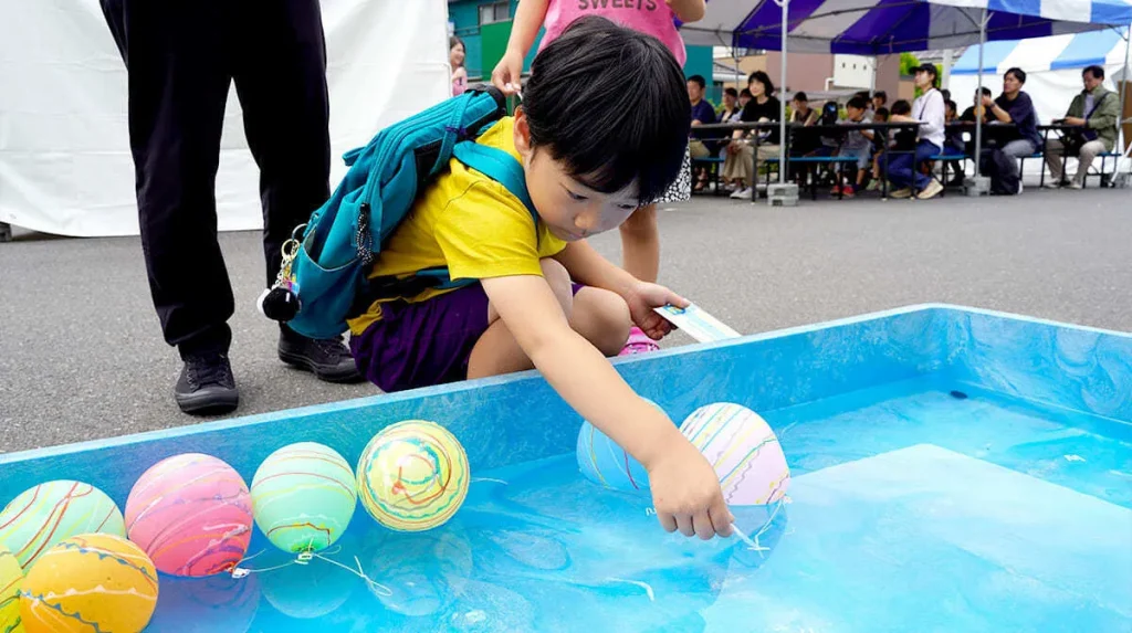 お祭りの定番、ヨーヨー釣り。すぐにコツをつかんで、何個もゲットする子が続出でした。