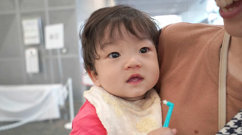 スタッフが、ワンタフトブラシの三角形の毛先を歯の間に当てて実演してみると……。小さなお子さんも「クルクル!」と元気よく答えてくれました。