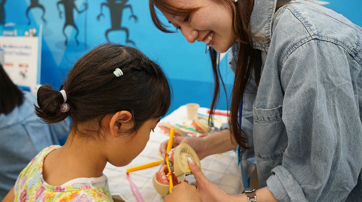 「子どもたちに知ってもらいたいのは、歯みがきの仕方じゃなくて歯みがきをする意味。 それを見て・触って・考えてもらえる予防体験ブースを用意しました」