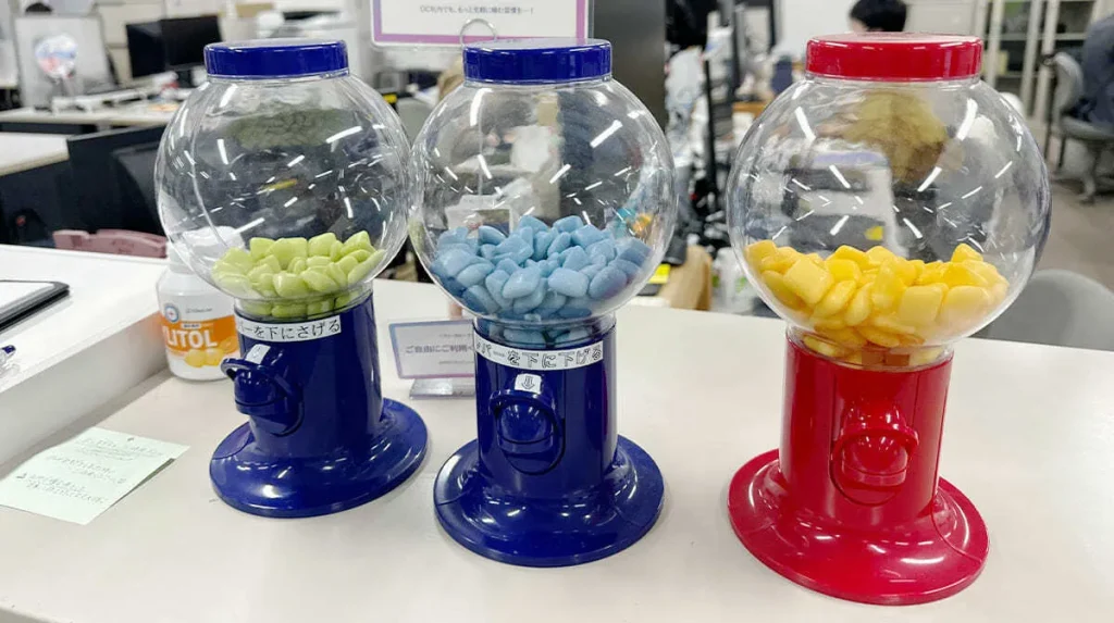 オーラルBizは、仕事中にガムを噛むことを推奨。お菓子感覚で楽しく予防ができるキシリトールガムを、ガムディスペンサーと一緒に提供します。